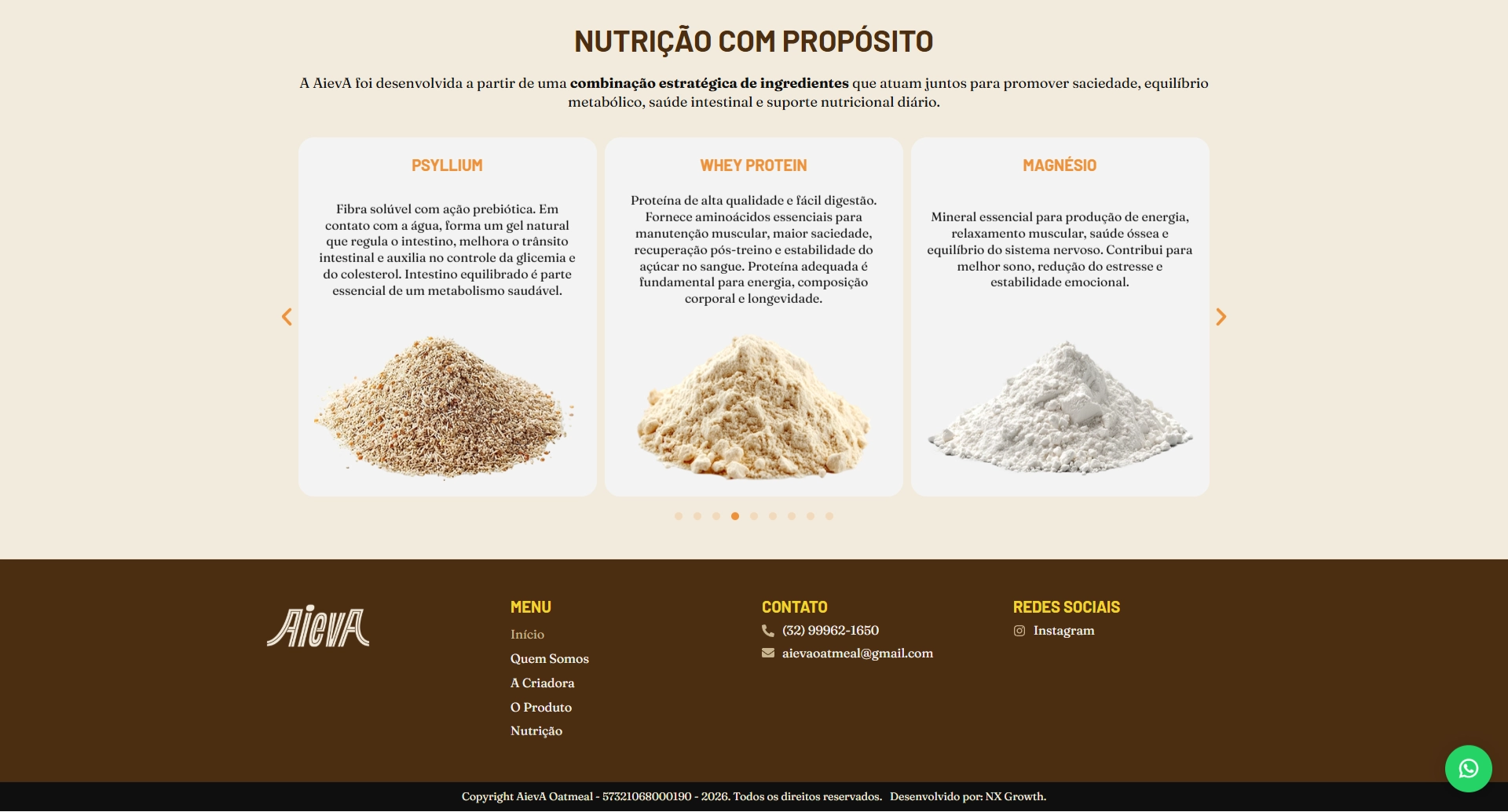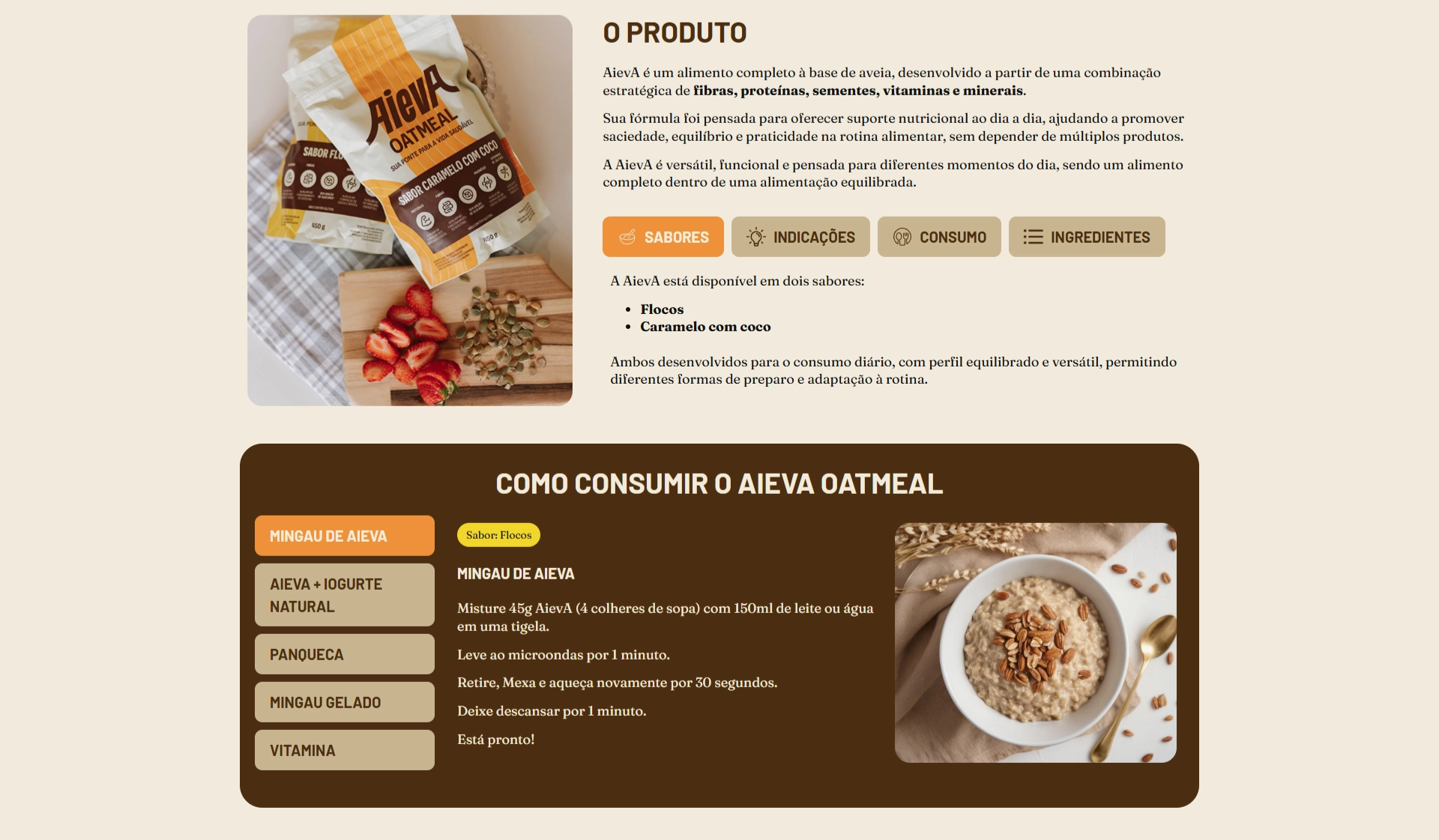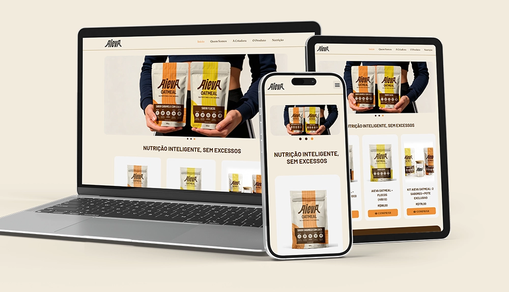 O site da AievA Oatmeal foi desenvolvido como uma plataforma institucional e comercial. A estrutura foi pensada para equilibrar autoridade científica, clareza informacional e conversão, apresentando a AievA como um alimento completo à base de aveia, criado a partir da prática clínica e da ciência nutricional.