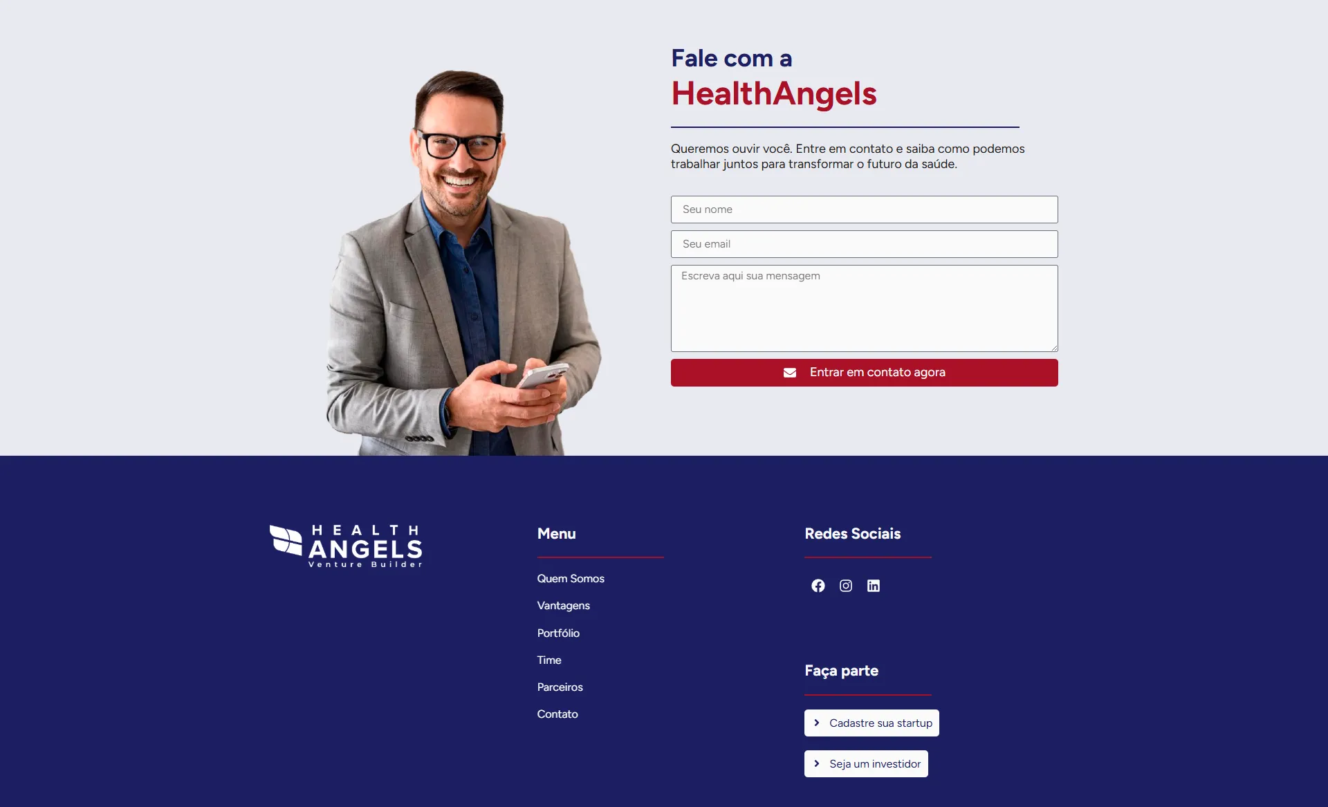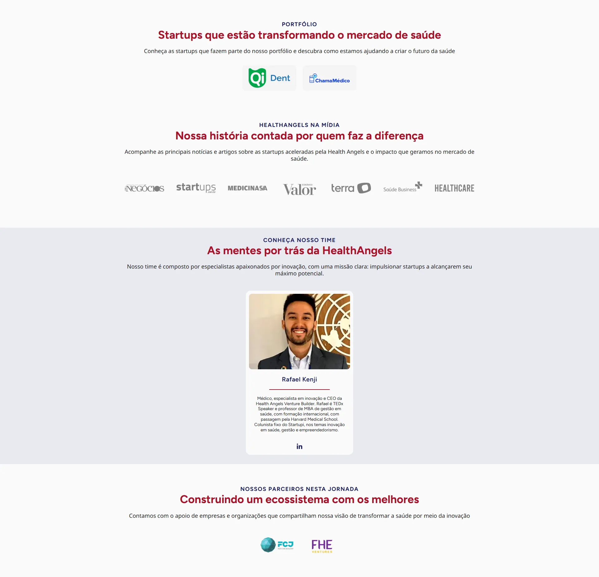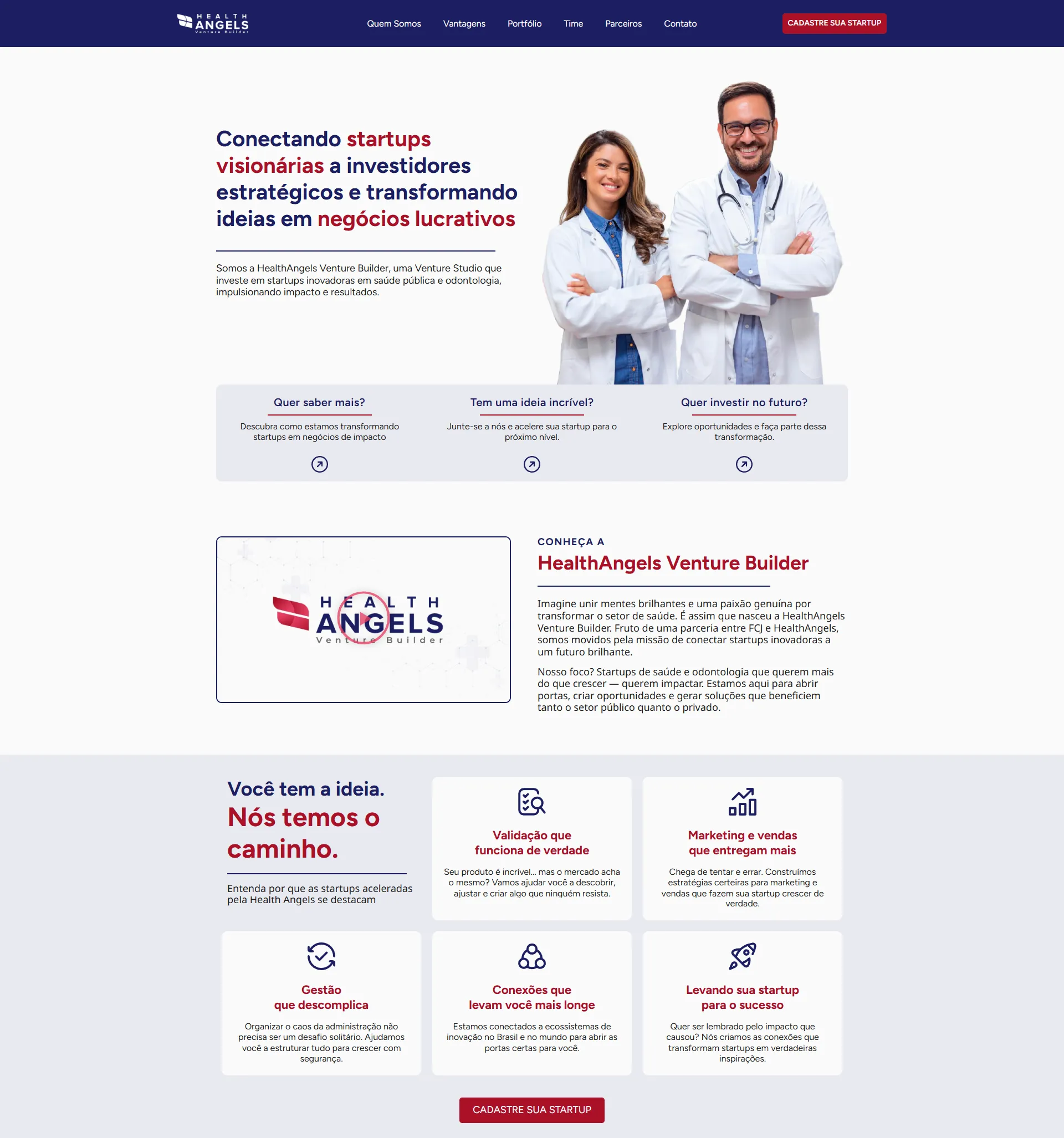 O projeto do site da HealthAngels Venture Builder foi desenvolvido no formato landing page e one page, com o objetivo de apresentar de forma clara e envolvente a proposta de valor da empresa.