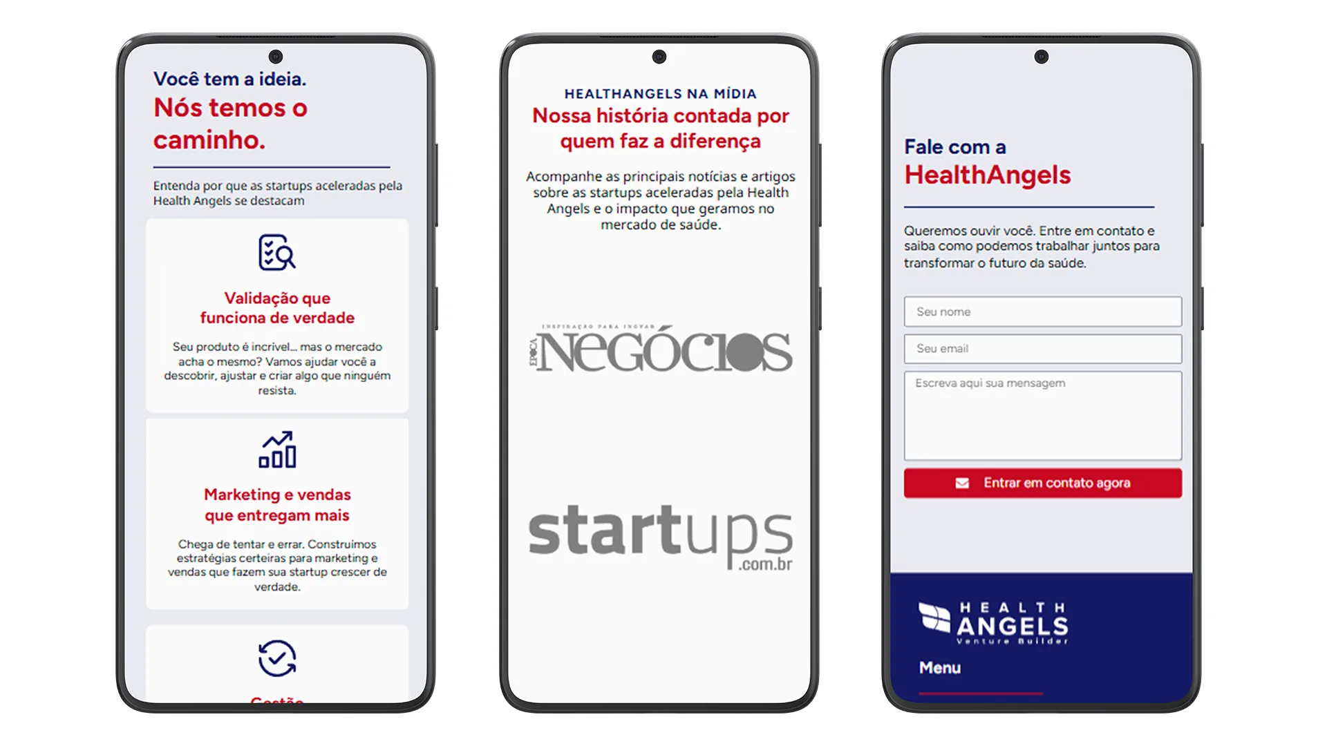 O projeto do site da HealthAngels Venture Builder foi desenvolvido no formato landing page e one page, com o objetivo de apresentar de forma clara e envolvente a proposta de valor da empresa.