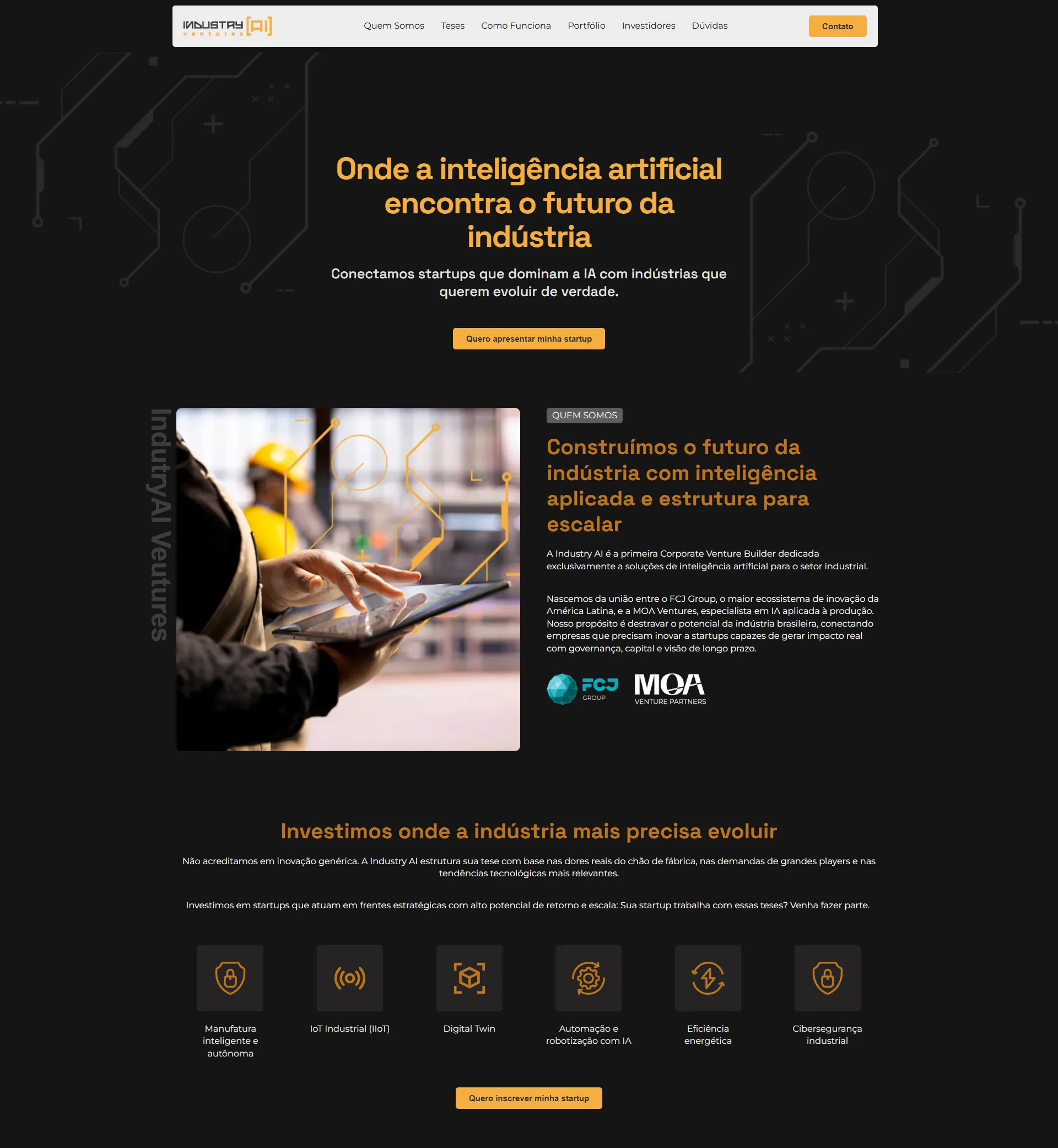 O site da IndustryAI Ventures foi desenvolvido no formato landing page e one page, com o objetivo de comunicar de forma clara e envolvente o valor da empresa. A nova plataforma apresenta a IndustryAI como uma Corporate Venture Builder única no ecossistema industrial, estruturando, investindo e transformando startups de inteligência artificial para enfrentar desafios reais do setor.