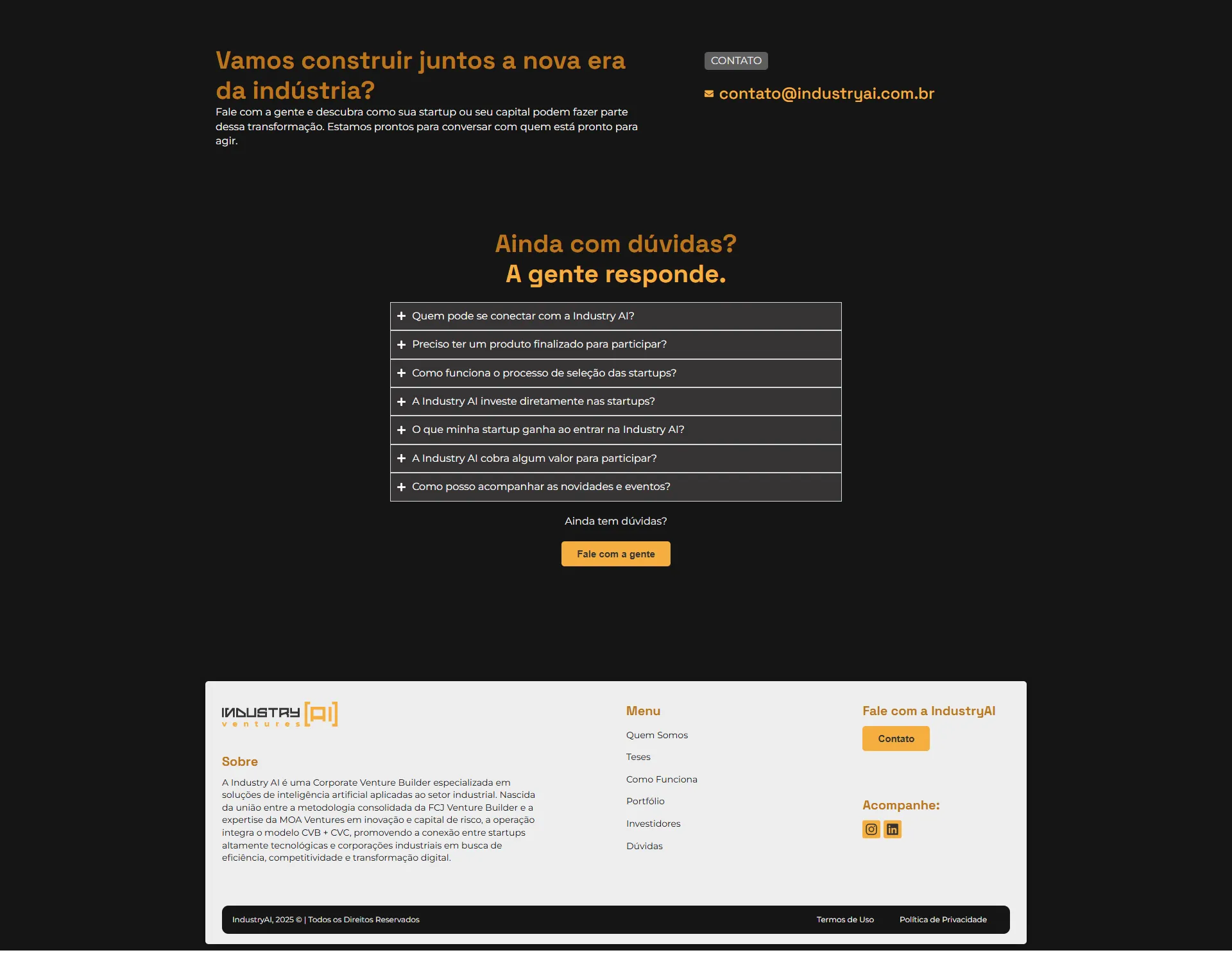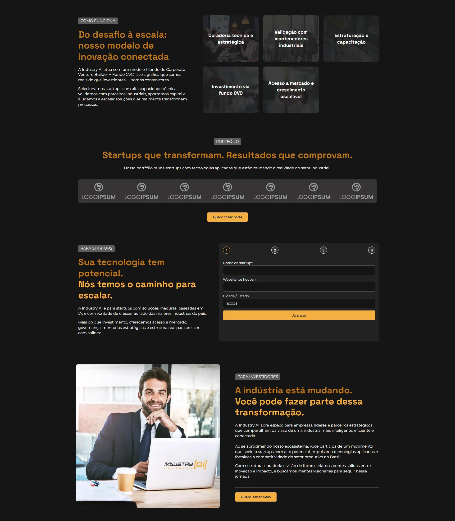 Cada seção guia o visitante por uma jornada fluida: da missão institucional e método híbrido CVB+CVC, até os critérios de seleção, portfólio e oportunidades. A interface revela como a IndustryAI conecta startups centradas em IA com empresas industriais maduras, entregando governança, capital e escala. O site reflete com precisão a visão da IndustryAI de construir o futuro da indústria com inovação inteligente e impacto duradouro.