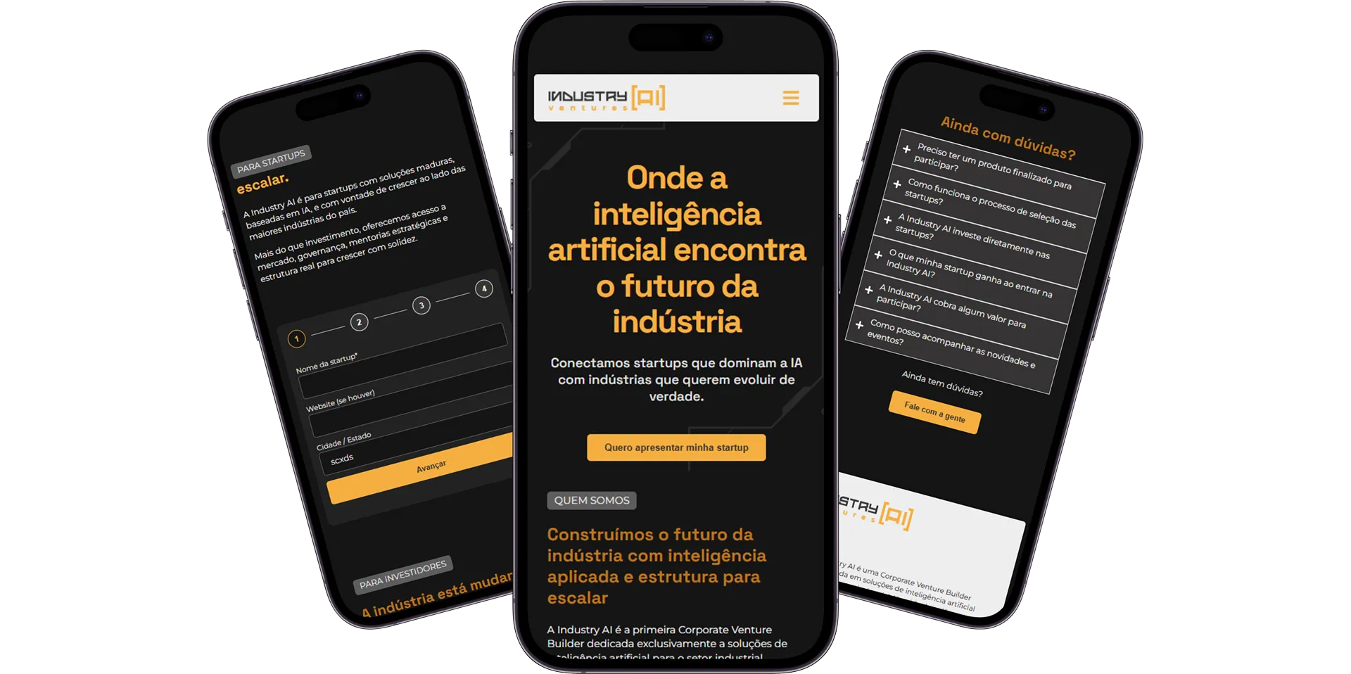 O site da IndustryAI Ventures foi desenvolvido no formato landing page e one page, com o objetivo de comunicar de forma clara e envolvente o valor da empresa. A nova plataforma apresenta a IndustryAI como uma Corporate Venture Builder única no ecossistema industrial, estruturando, investindo e transformando startups de inteligência artificial para enfrentar desafios reais do setor.