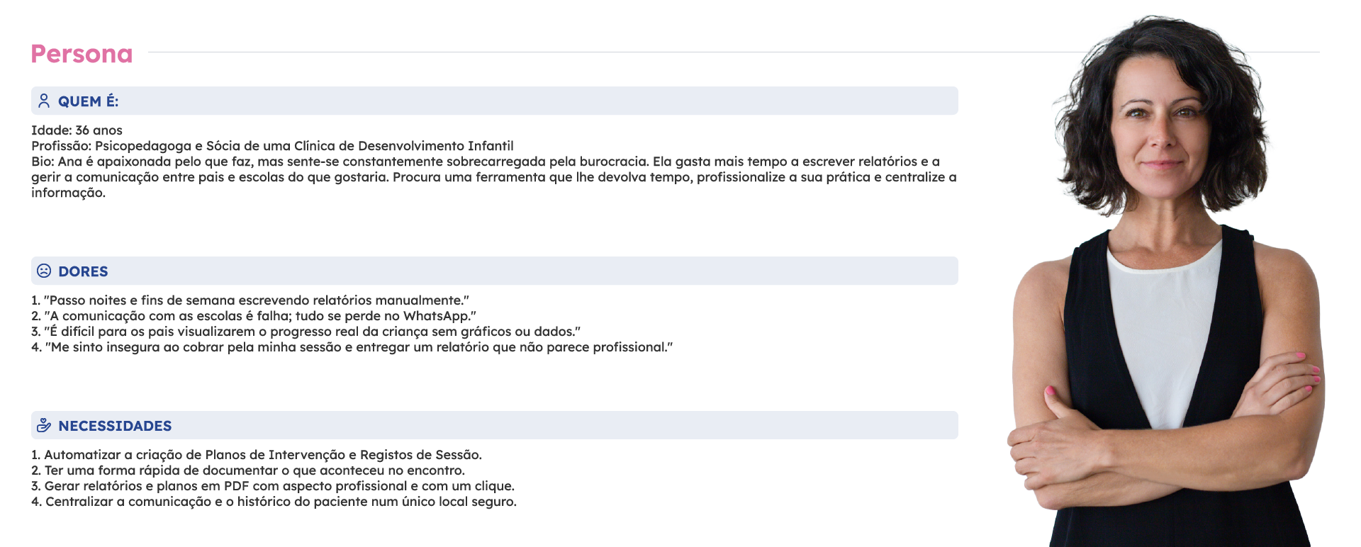 • UX Research: Conduzi entrevistas qualitativas com terapeutas para mapear suas dores, necessidades e fluxos de trabalho atuais.