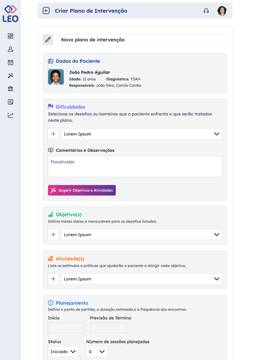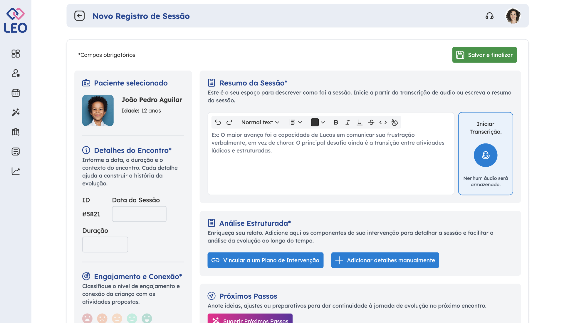 - Fluxo de Registro Otimizado: A interface de registro de sessão foi redesenhada para ser preenchida em poucos cliques, com uma hierarquia clara entre Demanda, Objetivo e Atividade, eliminando a ambiguidade do sistema anterior.