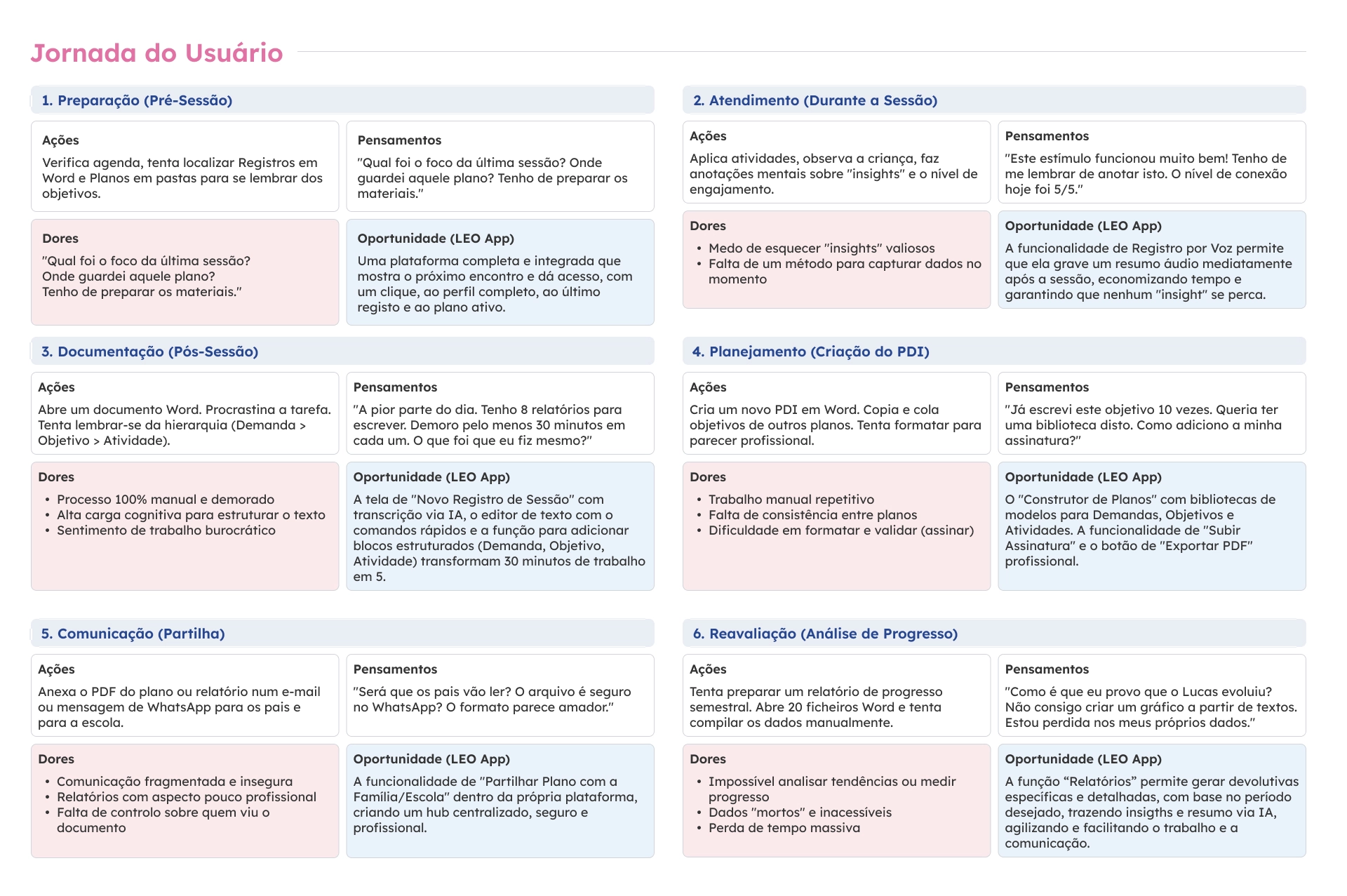 A primeira etapa foi uma imersão profunda no universo dos terapeutas. Através de entrevistas semiestruturadas, identifiquei os principais pontos de fricção: dificuldade em registrar dados durante as sessões, confusão na criação de planos de intervenção e a falta de uma visão unificada do progresso da criança. Essas descobertas foram cruciais para priorizar os problemas a serem resolvidos.