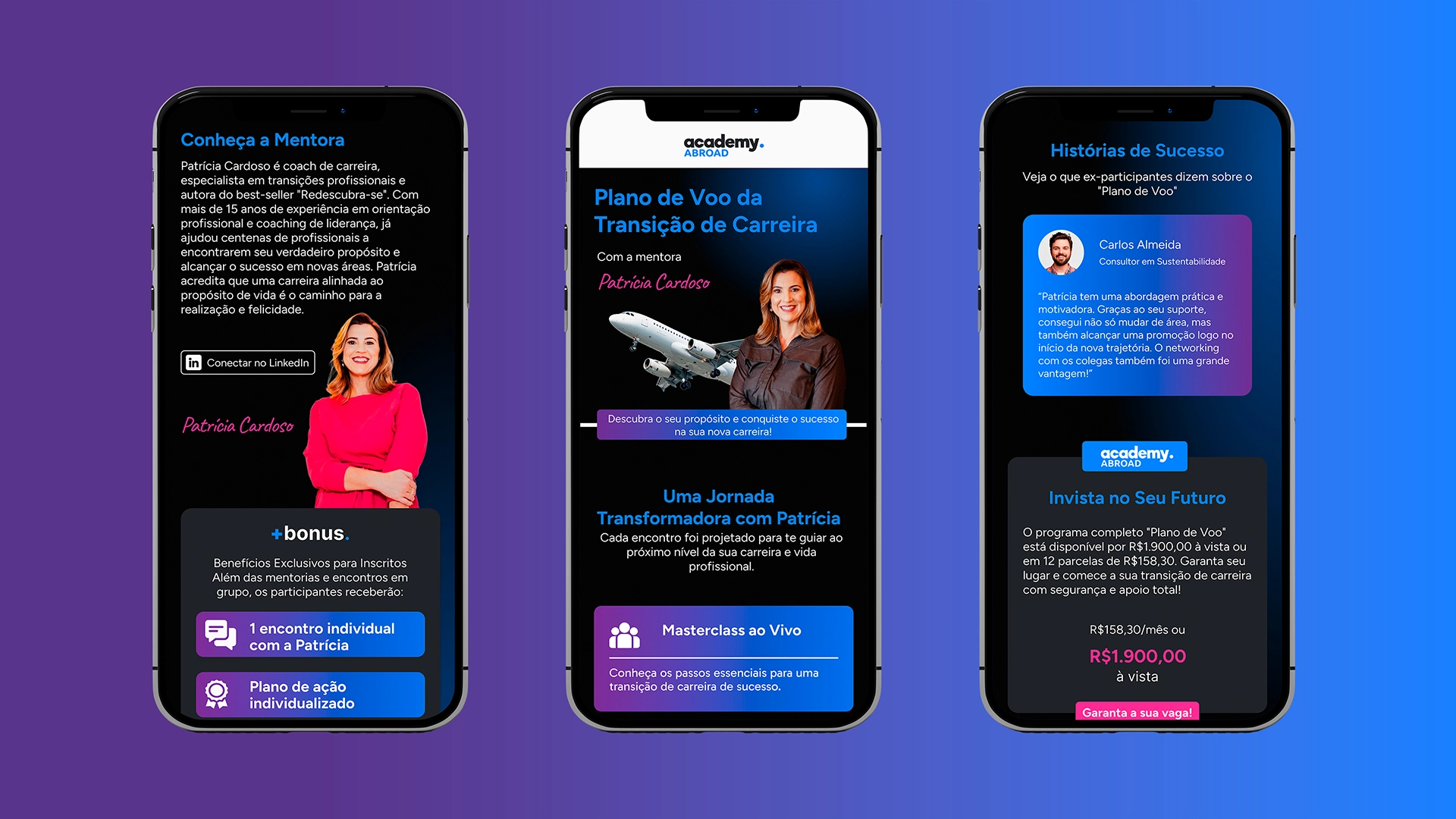 Este projeto foi desenvolvido para “Plano de Voo da Transição de Carreira”, um programa de mentoria liderado por Patrícia Cardoso, pela Academy Abroad, voltado para apoiar profissionais que desejam redirecionar suas carreiras em busca de realização e propósito.